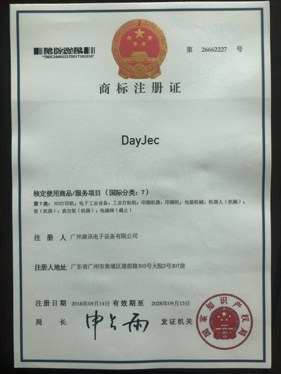 dayjec喷码机是德国进口合资技术的喷码机,Dayjec喷码机品牌商标于2017年9月商标申请成功,2018年9月商标注册成功。 Dayjec1000系列喷码机传承德国工艺技术,广州晨讯电子设备有限公司出品, Dayjec喷码机为全自动智能型喷码机,,Dayjec喷码机真正用到了德国喷码机流体学的核心技术, 可以让工业用品的喷码机放心使用…